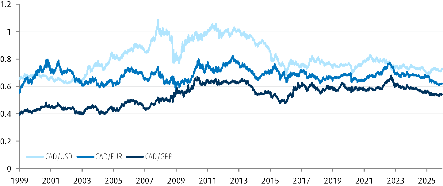 Source: Bloomberg and BMO GAM. Monthly value of CAD vs USD, EUR, GBP. As of December 31, 2025. Historical volatility is not an indication of future volatility.